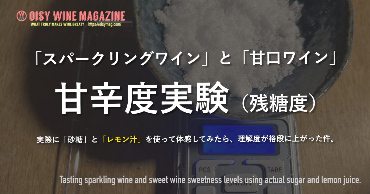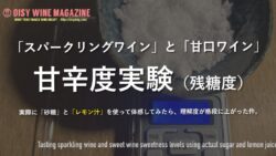 スパークリングワイン7段階と甘口ワインの残糖度を、砂糖水とレモン汁で再現して体感する実験記事。甘辛度への解像度が高まるの、ワインラヴァーからソムリエまで広くおすすめできる実験です。。