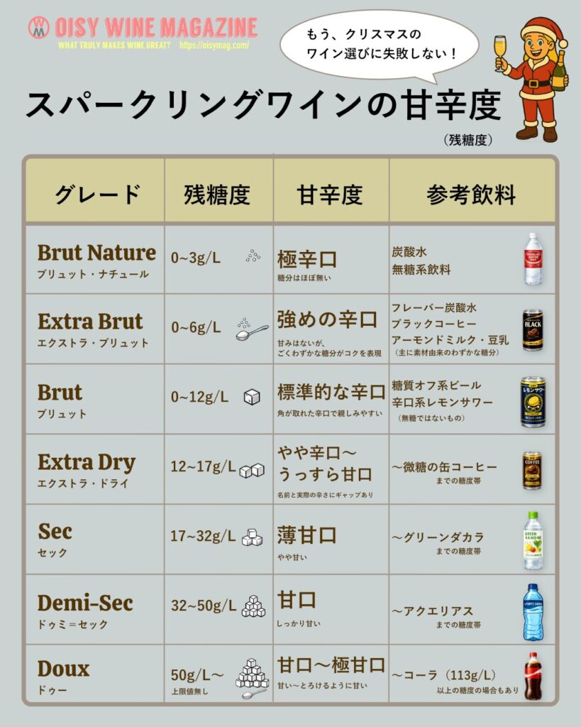 スパークリングワインの「甘辛度(残糖度)」一覧