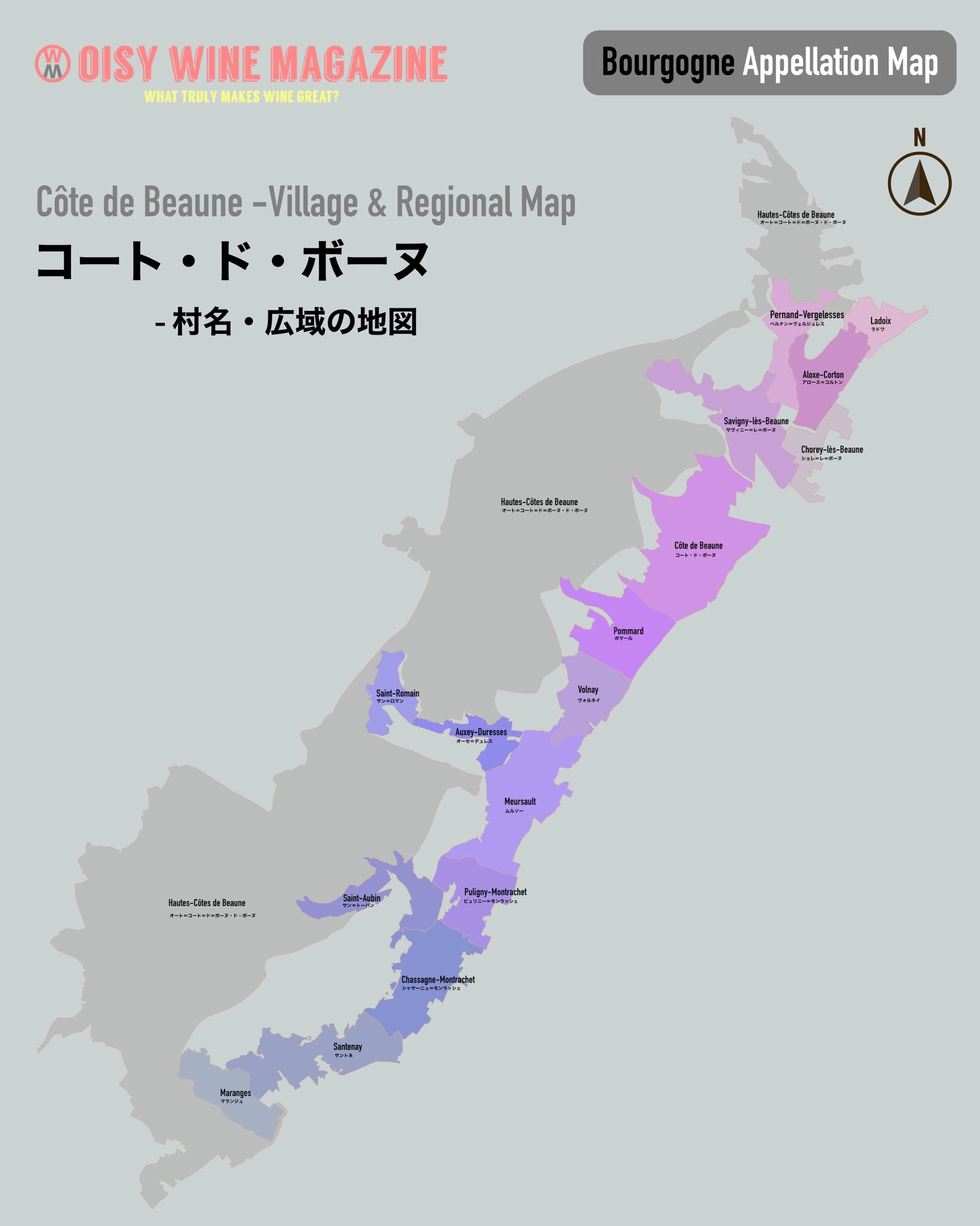 「コート・ド・ボーヌ」地区の村名、広域アペラシオンの地図です。