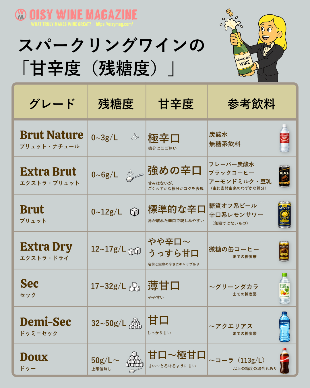 スパークリングワインの甘辛度(残糖度)の一覧表(図解版)